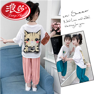 浪莎童裝女童夏裝中大童洋氣t恤純棉短袖套裝兒童寬松冰絲防蚊褲