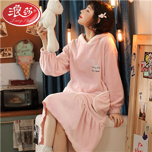 浪莎冬季法蘭絨睡裙女冬長(zhǎng)袖可愛(ài)卡通韓版帶帽睡裙家居服可外穿